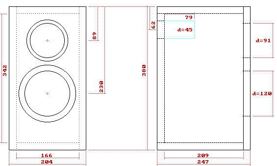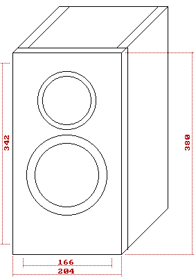 Die Gehäuseskizze gilt für den Aufbau aus 19 mm MDF. Bei Verwendung anderer Materialstärken (z.B. 18 oder 20 mm MPX) müssen die Maße entsprechend umgerechnet werden, wobei die Schallwandabmessungen beibehalten werden sollten.
