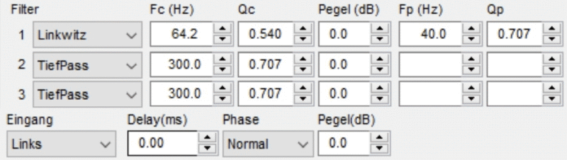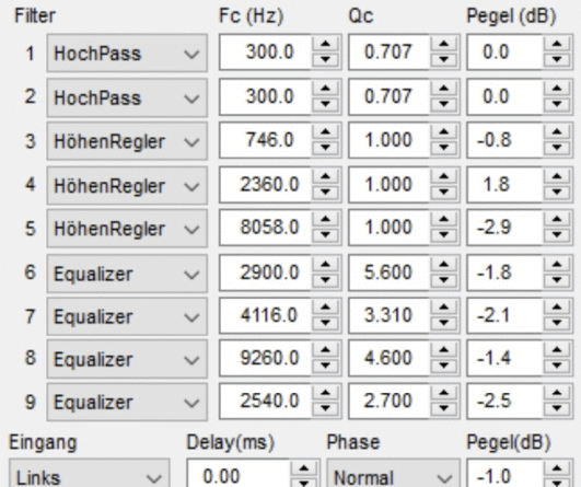 Tipp: Die Basslautstärke können sie über den Pegel des Breitbänders beeinflussen. Bei zuviel Bass erhöhen sie den Pegel des Breitbänders, bei zu wenig Bass vermindern sie diesen. Typische Werte liegen zwischen 0 und -2 dB. Die voreingestellten -1 dB sind ein guter Kompromiss, denn durch wandnahe Aufstellung erhöht sich der Basspegel.