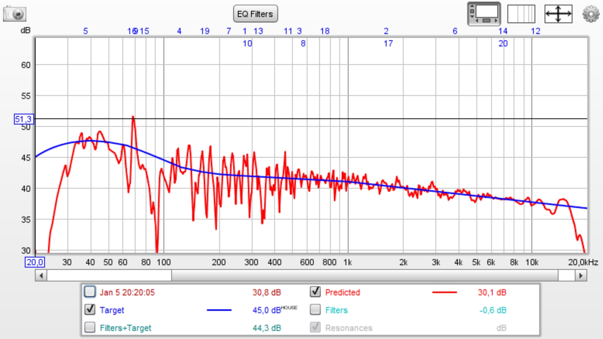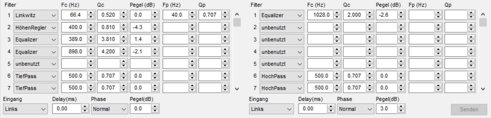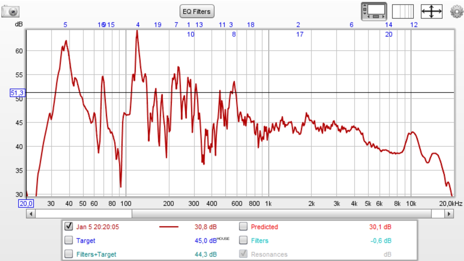 In diesem Fall wurden nicht alle Filter im Breitbänder-Zweig benötigt, denn das hatte REW dann erledigt. Der Equalizer bei 1028 Hz mußte drin bleiben, da dieser Einfluß auf das Verhalten bei der Trennfrequenz zum Tieftöner hat.