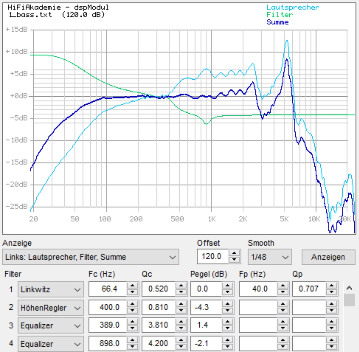 Nun wurden die Trennfrequenzen gesetzt und der Frequenzgang des Breitbänders entzerrt.