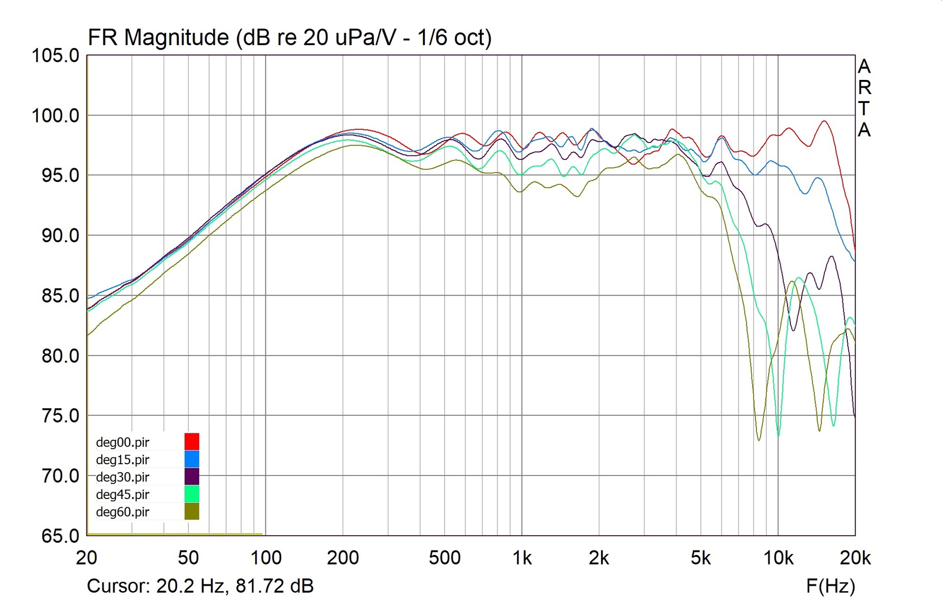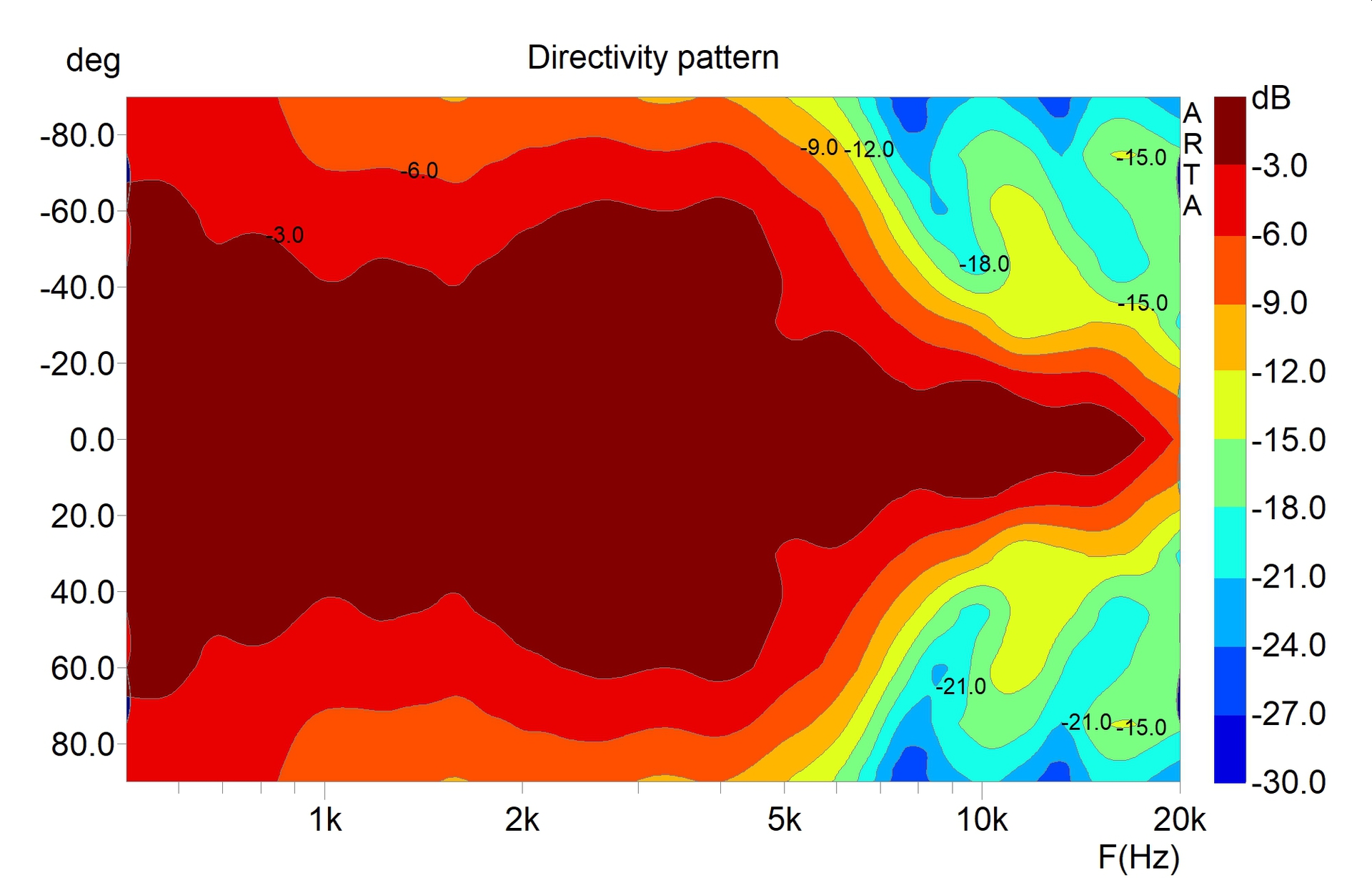 Man beachte in obigem Diagramm die Senke bei 2,8 KHz. Das gehört so, denn diese wird unter Winkeln aufgefüllt. Hier die 0 und 30 Grad Kurven: