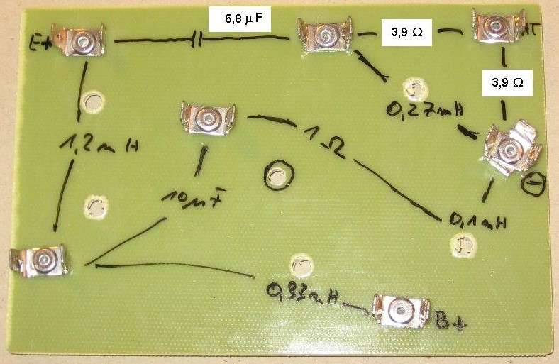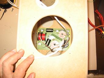 Die Frequenzweiche wird mit einer Schraube von innen an die Rückwand der Box geschraubt. Bei Verwendung von Platinen sollte man einen Streifen Sonofil unterlegen, damit die Schwingungen des Materials bedämpft werden. Bei Aufbau auf einem Brett kann das vernachlässigt werden.