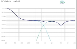 Mit einem HiFiAkademie-DSP habe ich drei verschiedene Abstimmungen realisiert - eine lineare, eine nach psychoakustischen Erkenntnissen und eine für den Schreibtisch. In allen Fällen wurde der Baß mit einem Linkwitz-Entzerrer auf 30 Hz Qtc 0,707 korrigiert. Für die Schreibtisch-Aufstellung wurde der Baßbereich im Pegel um einige dB zurückgenommen, da dieser sonst durch die nahe Wand zu aufgebläht wäre.