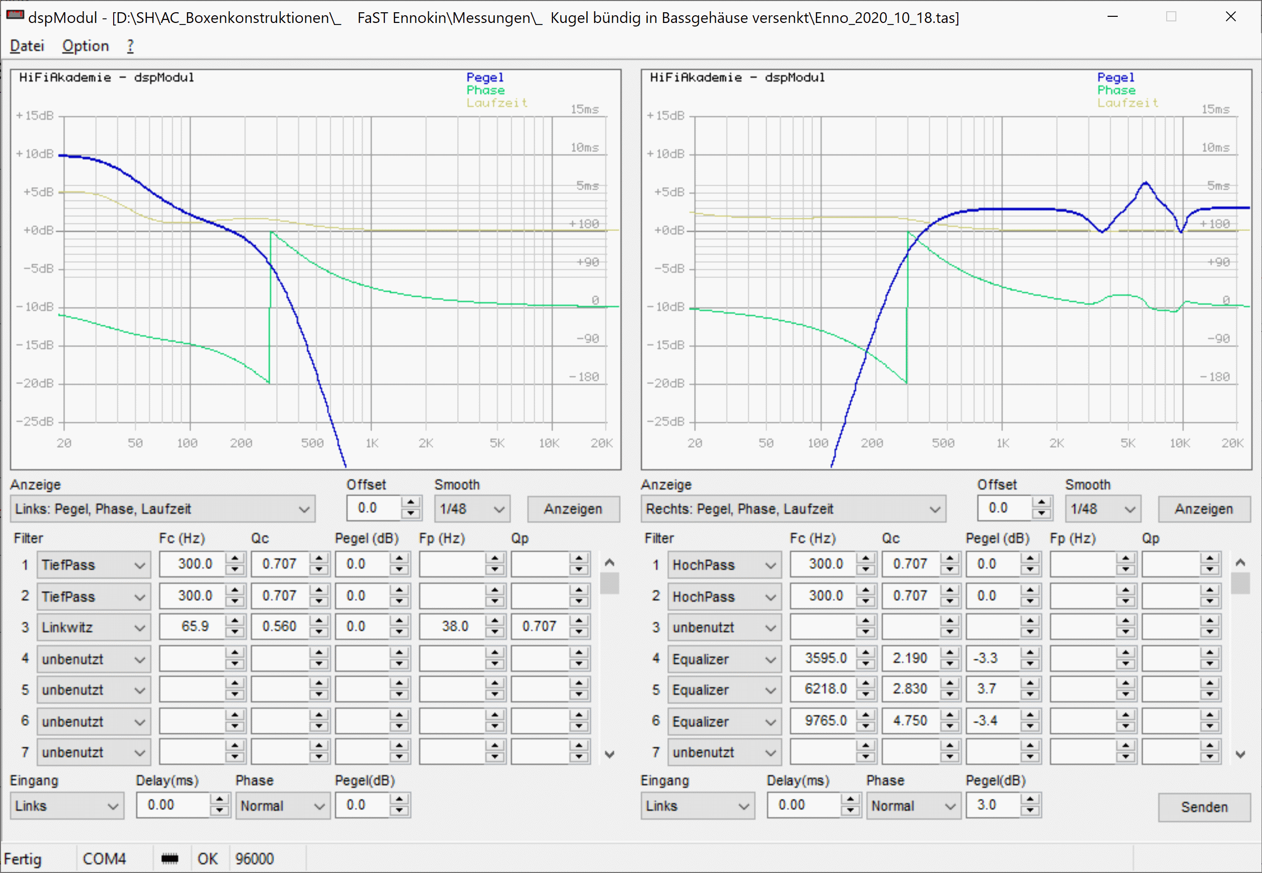 Da ich für Sphere keine DSP-Freifeld-Einstellung erstellt hatte zeige ich hier die Messungen einer sehr ähnlichen Box, deren Abstimmung ich für einen Forenkollegen entwickelt hatte, die bis auf einen anderen Breitbänder mit meiner quasi identisch ist.