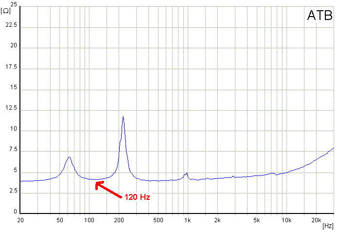 Impedanz Die Baßreflexkanal-Abstimmfrequenz liegt bei 120 Hz. So etwas wie Bass ist von einer solchen Box nicht zu erwarten.