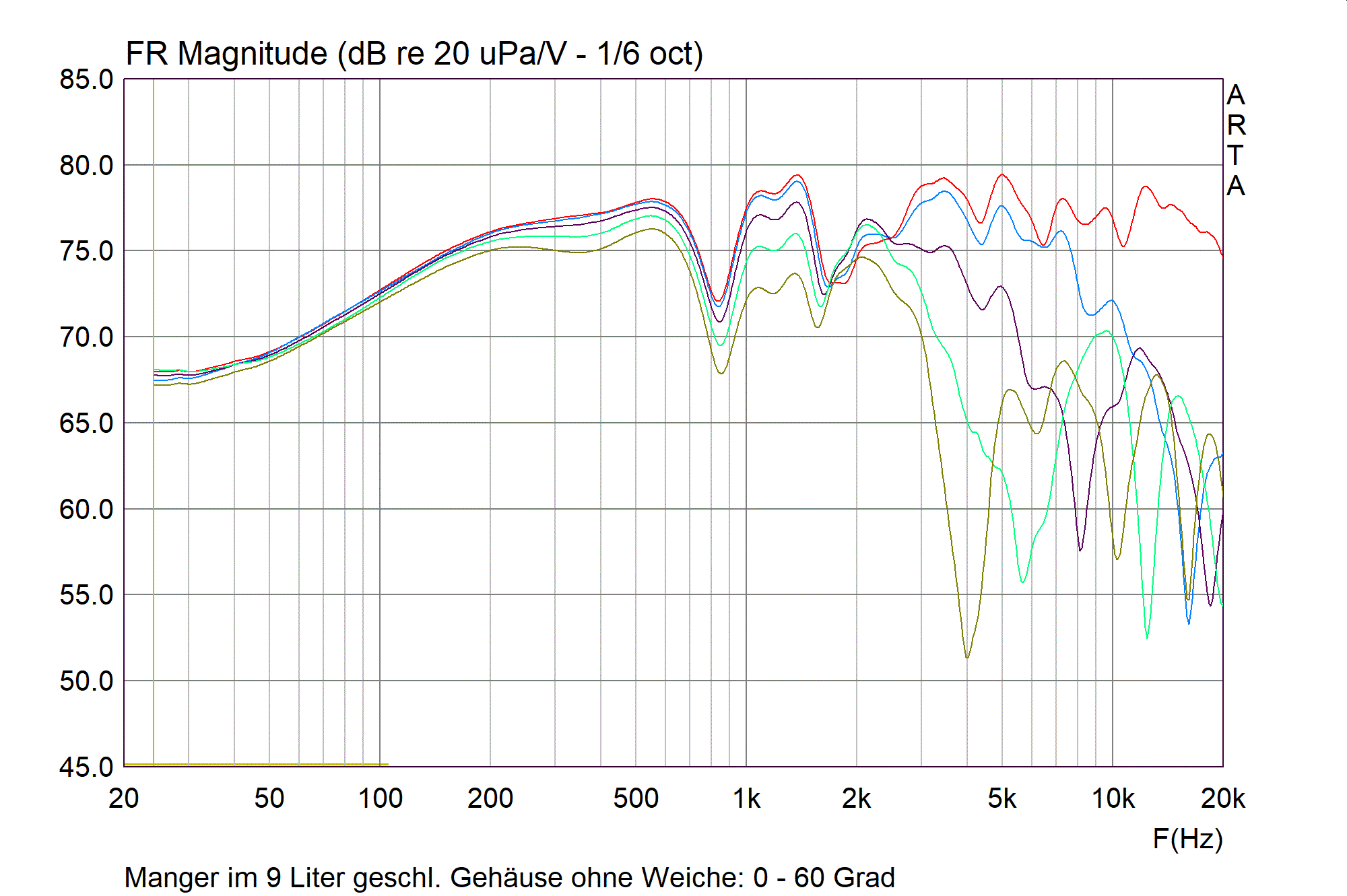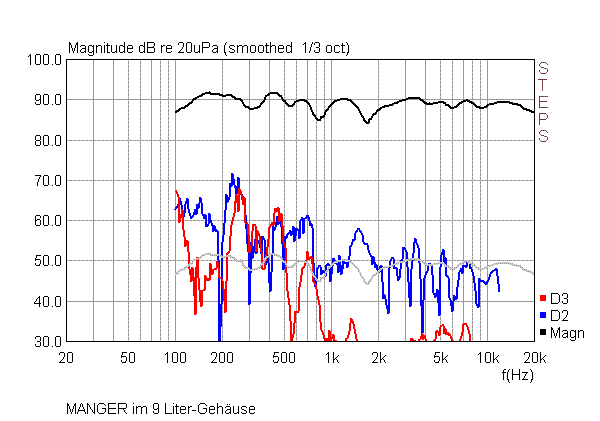 Diese Box wurde zum Test des MSW aufgebaut. Das Innenvolumen beträgt 9 Liter. Gedämmt ist das Gehäuse mit einer Lage Noppenschaumstoff (Tyrotex N30) an der Rückwand. Das restliche Gehäuse wurde locker mit Sonofill gefüllt. Die Messungen erfolgten ohne Frequenzweiche.