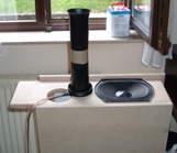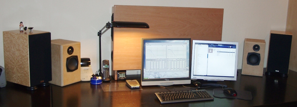 Unter dem Schreibtisch hatte ich schon verschiedene Subwoofer im Einsatz, aber jeder war entweder nicht hörbar oder viel zu laut und damit ortbar. Nach Jahren des Hörens mit kleinen Zweiwegeboxen kam wieder mal der Wunsch nach richtigem Bass auf und die Lösung des Problems war ein Sub auf dem Schreibtisch. Übliche Subwooferkonstruktionen sind aus naheliegenden Gründen auf dem Schreibtisch nicht plazierbar. Die Lösung war ein Sub mit einer sehr geringen Bautiefe von lediglich 21 Zentimetern. Möglich wurde dies durch die Verwendung des ovalen Tangband-Tieftöners W69-1042. Die Membranfläche entspricht der eines 20-cm-Chassis, aber die schmalere Seite des Chassis misst lediglich 16,5 Zentimeter.