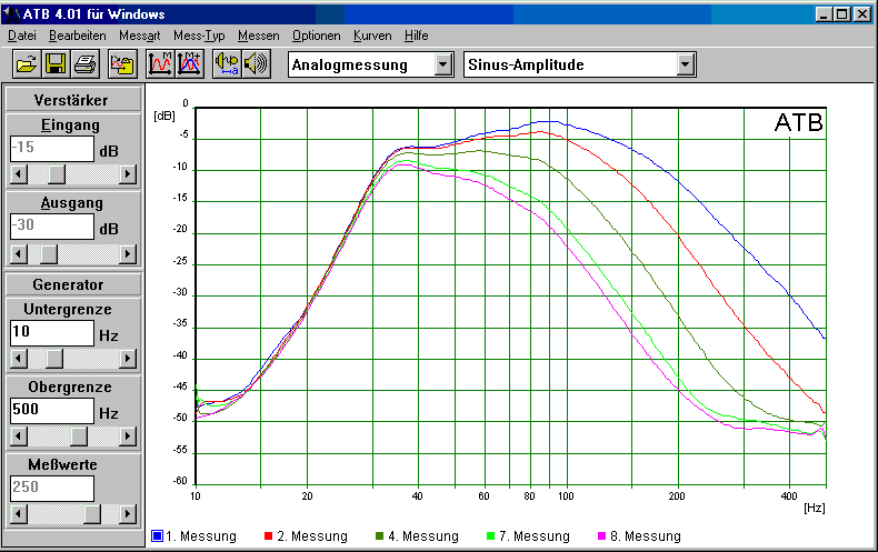 Gemessen wurden 5 verschiedene Trennfrequenzeinstellungen am MIVOC AM 120. Diese sind im Schaubild von oben nach unten dargestellt.