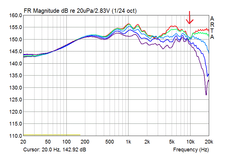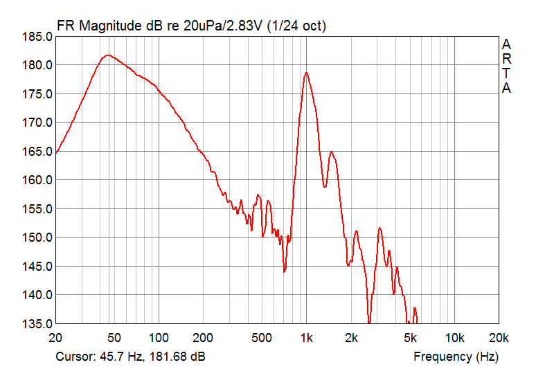 Hier ist es wichtig, das Mikrofon möglichst nahe am Baßreflexrohr zu positionieren ohne das es in den Kanal eintaucht. Ich halte dazu eine Scheckkarte vor den Kanal und stelle das Mikro so auf, daß es diese geradeso einklemmt. Danach entferne ich die Karte und messe. Bemerkenswert ist der Peak bei 1 KHz. Warum wohl baue ich den Baßreflexkanal bei Zweiwegeboxen immer in die Rückwand ein? ;-)