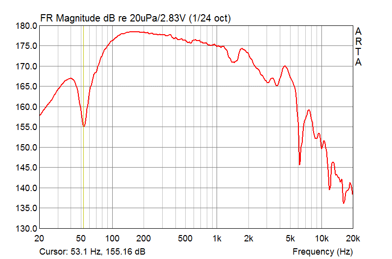 Hier ist es wichtig, das Mikrofon möglichst nahe an der Membrane zu positionieren. Aus dieser Messung kann man sehr schön die Baßreflex-Abstimmfrequenz des Gehäuses ablesen. Diese befindet sich in Position der Senke - siehe die gelbe senkrechte Linie bei 53 Hz.