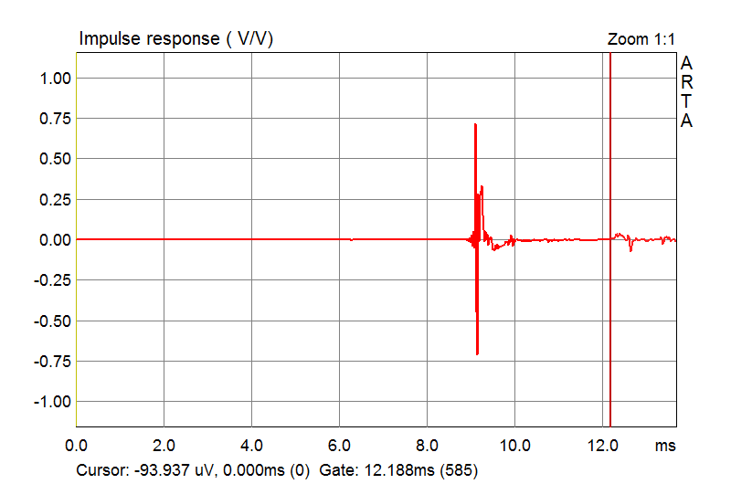 Hierbei wird das Mikrofon einen Meter von der Box entfernt aufgestellt. Diese steht idealerweise auf einem Drehteller, so daß die Messung unter verschiedenen Winkeln erfolgen kann. Gemessen wird mit einem gefensterten MLS-Signal, was eine quasi-Freifeldmessung ohne Raumeinflüsse ergibt. Das klappt natürlich im Bass, abhängig vom Abstand der Box zum nächsten reflektierenden Objekt (Boden, Decke, Wände, Möbel, etc.), nur bis zu einer gewissen unteren Grenzfrequenz. Im zweiten Bild unten sieht man die erste Reflektion rechts von der senkrechten roten Linie.