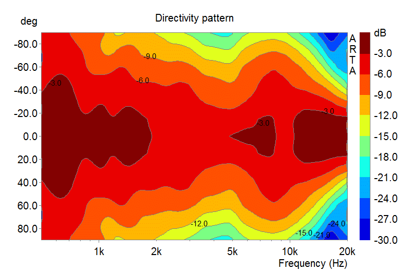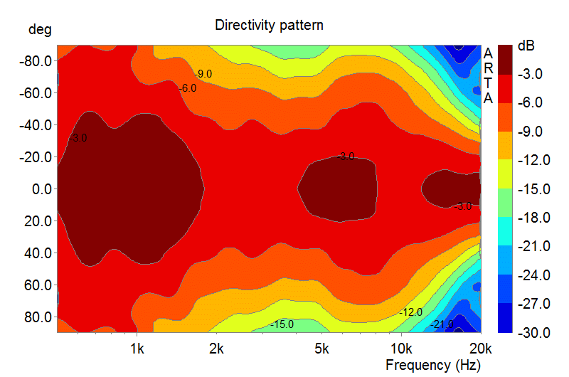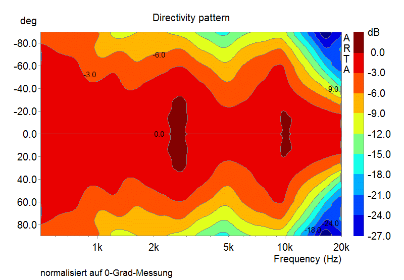 Weiterhin könnte man die Senke um die 9 KHz herum mit einem Equalizer auffüllen. Betrachtet man die Messungen der Box ohne DSP, dann sieht man, daß die Senke ab der 30 Grad-Messung nicht mehr vorhanden ist. Eine Korrektur wäre zuviel des Guten, deshalb lasse ich auch diese drin.