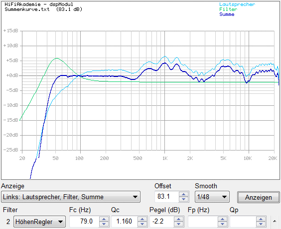 Ein Höhenregler (highshelf) senkt den Bereich über 79 Hz um 2,2 dB ab.