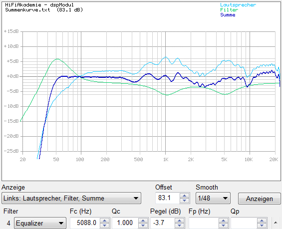 Jetzt begradige ich noch etwas den Frequenzgang, widerstehe aber der Versuchung, jeden kleinen Schlenker im Frequenzgang ausgleichen zu wollen.
