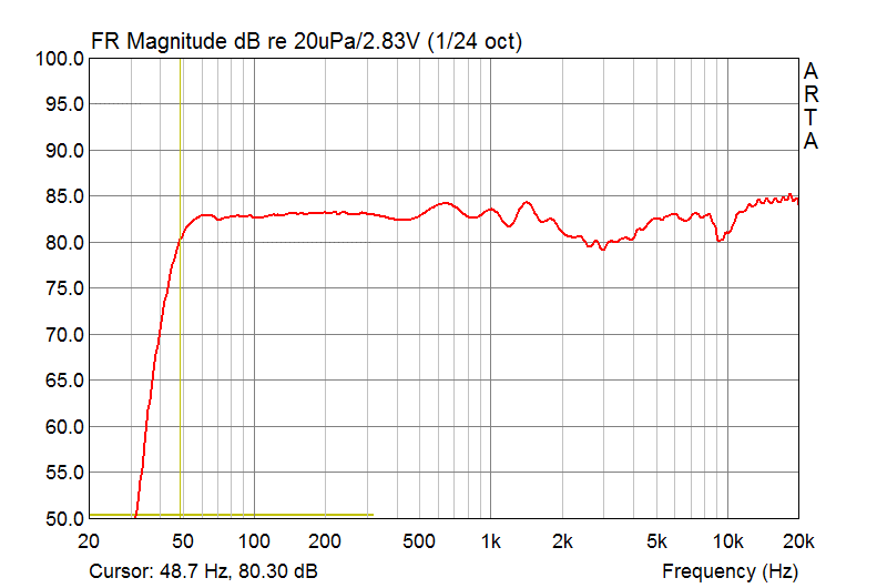 Durch diese beiden Maßnahmen habe ich die untere Grenzfrequenz (-3 dB) der Box von 84 Hz auf 49 Hz gesenkt. Die erreichbare Maximallautstärke der Box verringert sich um etwa 8 dB, wovon knappe 6 dB der Pegelanhebung des Basses und 2,2 dB der Pegelabsenkung ab 79 Hz geschuldet sind. Ganz so schlimm ist es aber nicht. Weil der Hochpass die Box von ganz tiefen Frequenzen entlastet verträgt diese etwas mehr Leistung als ohne Entzerrung. Mehr als 95 dB sollten durchaus noch im Rahmen des Möglichen liegen.