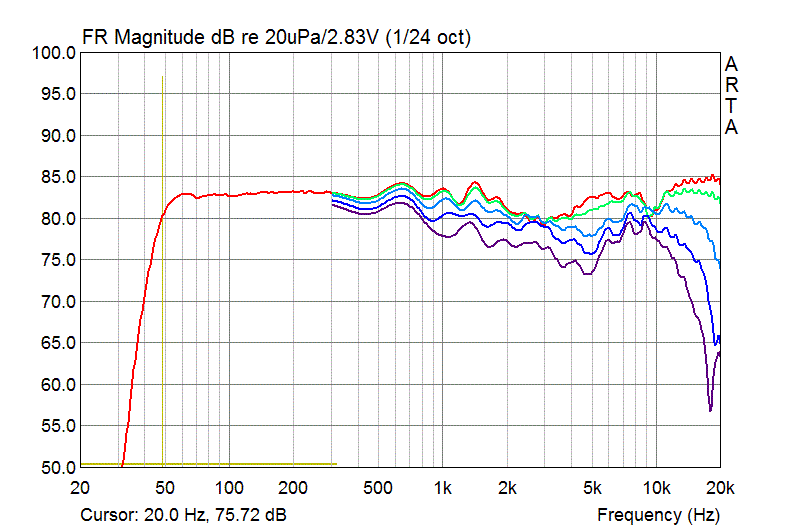 Jetzt setze ich einen überschwingenden Hochpass. Dieser entlastet die Box von (ganz) tiefen Tönen, die der kleine Treiber sowieso nicht kann und sorgt gleichzeitig für mehr Pegel im hörbaren Bassbereich.