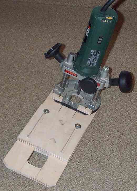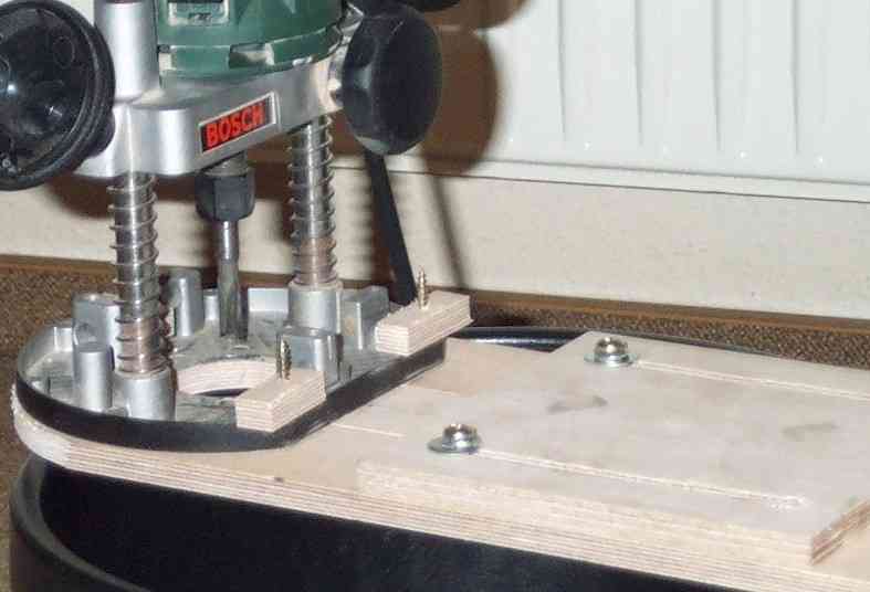 Im nächsten Bild sieht man die Befestigung der Oberfräse an der Grundplatte (Holzschraube von unten durch