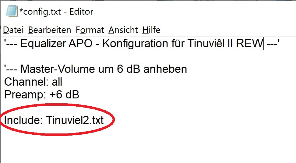 In der Datei config.txt binden wir mit Hilfe des Include:-Tags die Datei mit den DSP-Einstellungen ein.
