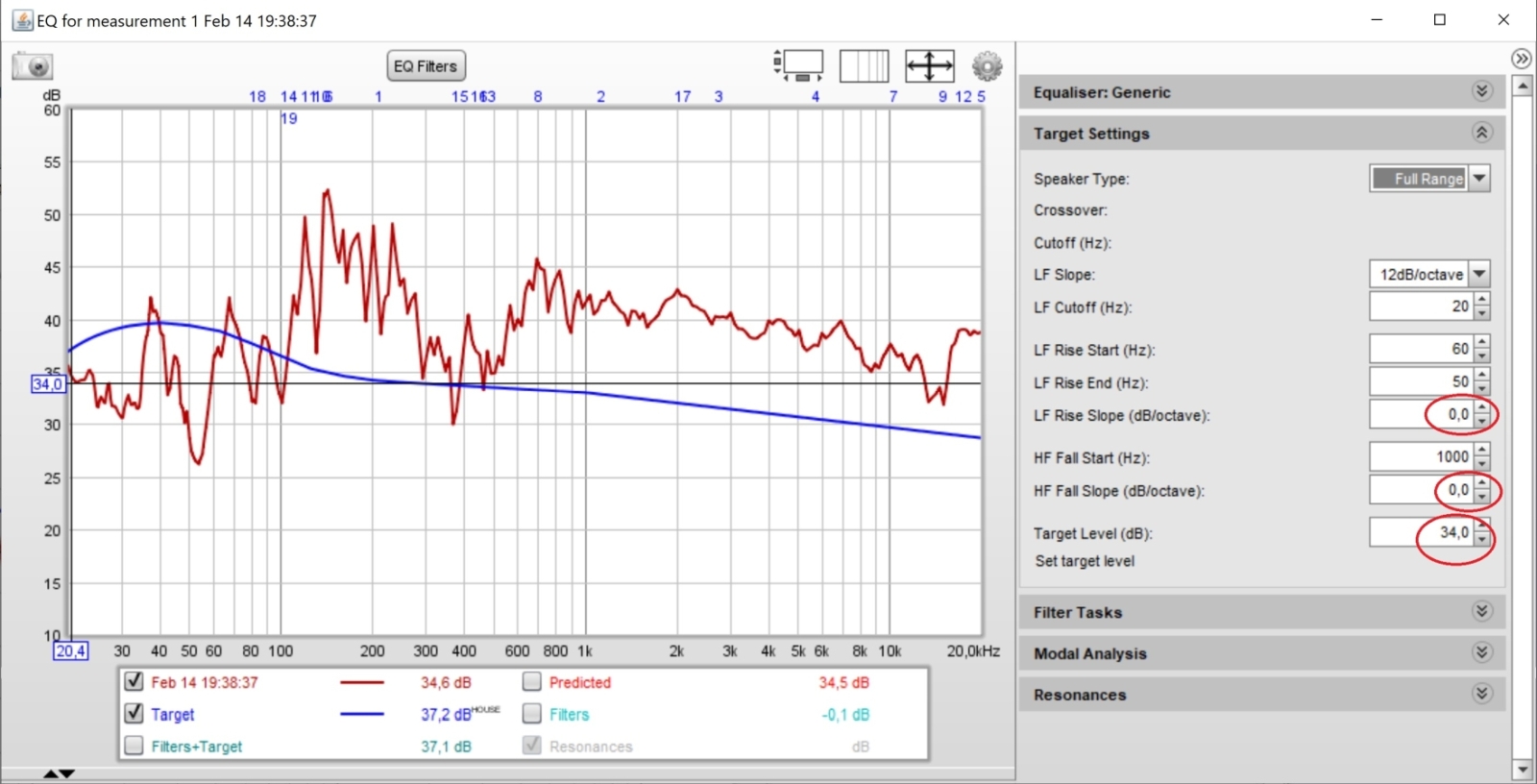 Mit Hilfe des Fadenkreuzes im Diagrammfenster ermitteln wir den Pegel, auf den wir entzerren möchten. Dazu halten wir die linke Maustaste gedrückt und verschieben den Cursor innerhalb des Diagramms. Den gefundenen Wert tragen wir als Target Level ein und achten auch darauf, daß in den anderen beiden markierten Eingabefeldern jeweils eine Null steht.