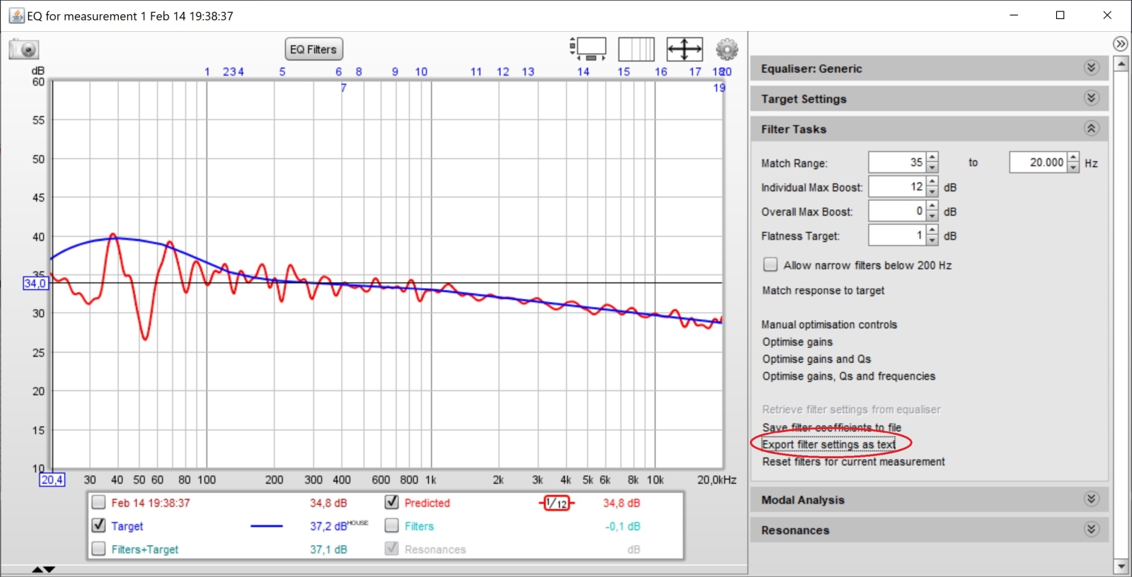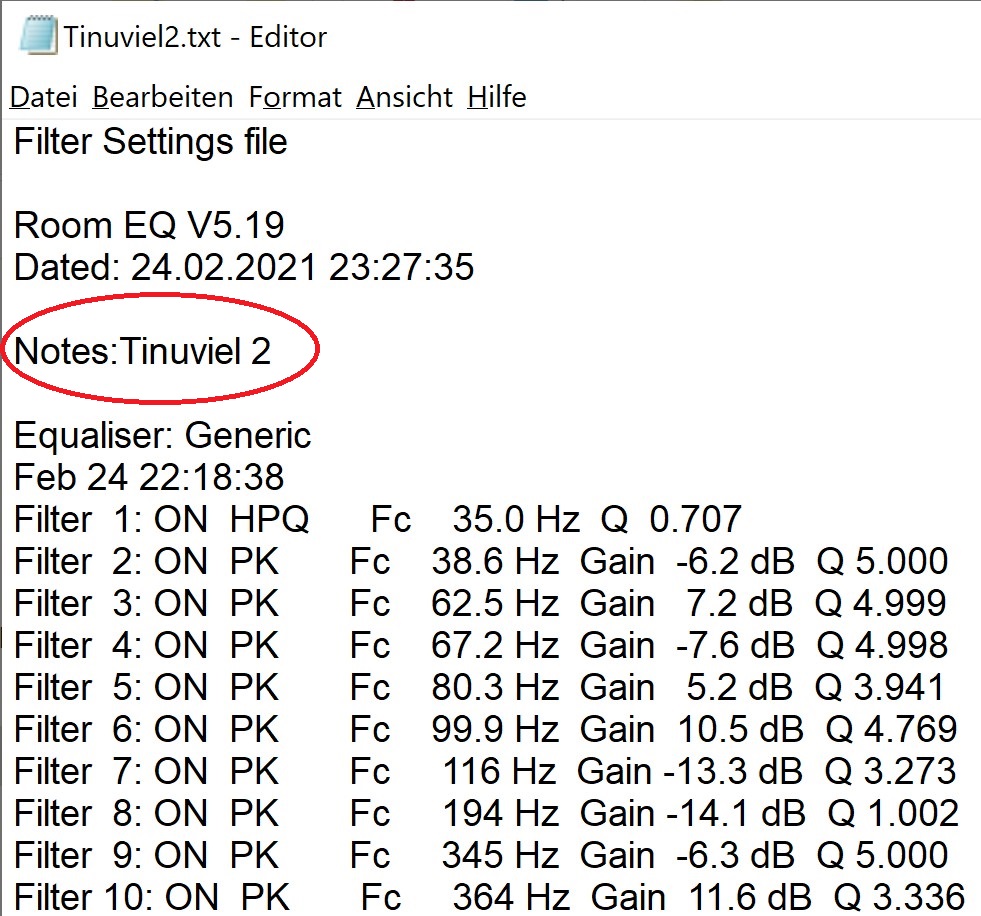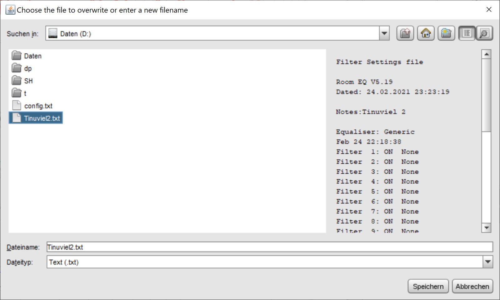 Jetzt speichern wir die Filter im für Equalizer APO verständlichem Dateiformat.
